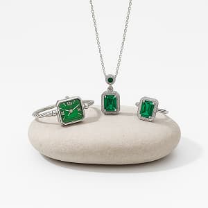 ست زنانه ساعت و گردنبند و انگشتر مدل زمرد-نقره ای